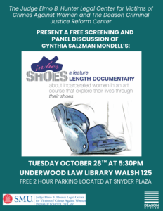 SMU Law was honored to host a screening of IN HER SHOES during Domestic Violence Awareness Month. The film, was followed by an interdisciplinary panel of experts, highlighted the importance of maintaining identity in a system that tries to regulate and enforce conformity. Attendees were moved by the depictions of hope and humanity that art restored to incarcerated and criminalized survivors.-Natalie Nanasi,  Professor of Law,Director, Judge Elmo B. Hunter Legal Center for Victims of Crimes Against Women,SMU Dedman School of Law
